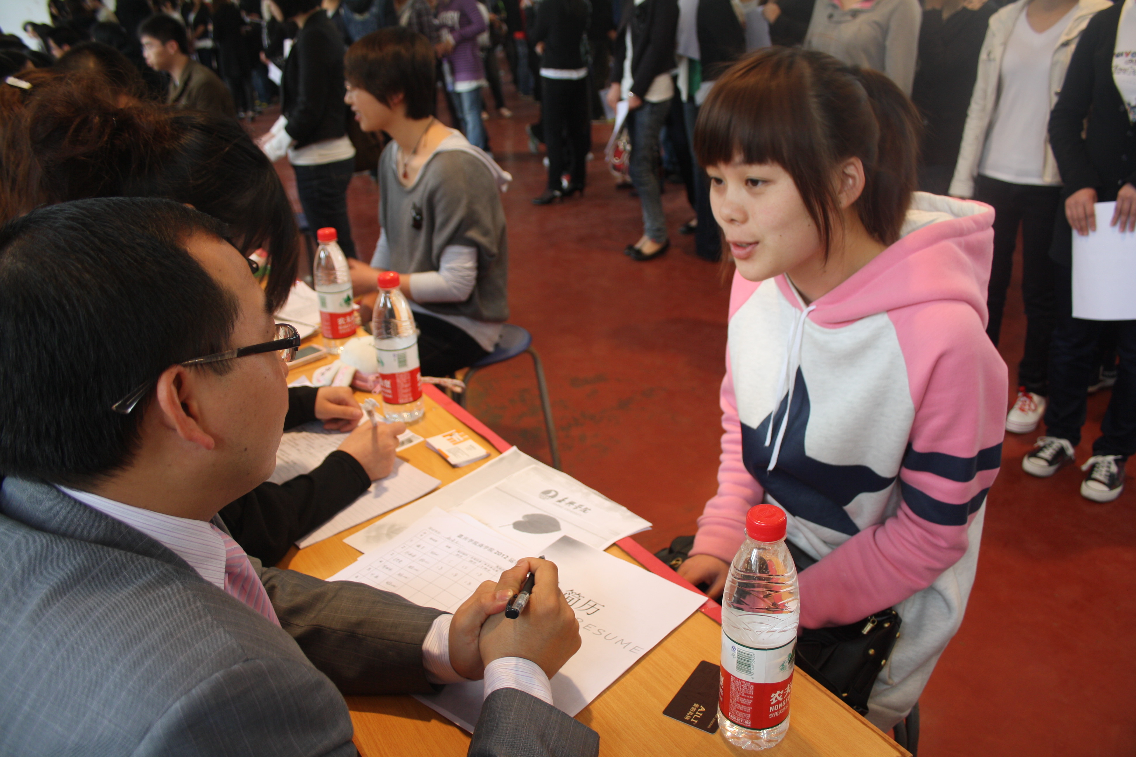 4月16日,百家乐赔率 2012届毕业生模拟面试在体育馆102隆重拉开序幕。30位人力资源专业学生担任考官助理,配合校外邀请的30位面试考官,共同面试了前来应聘的2012届毕业生。嘉兴百家乐赔率 学生工作处副处长薛峰老师、百家乐赔率 党委副书记郝文静老师、百家乐赔率 各系研究所所长和就业指导办公室老师也参加了本次模拟面试,并给予积极肯定。