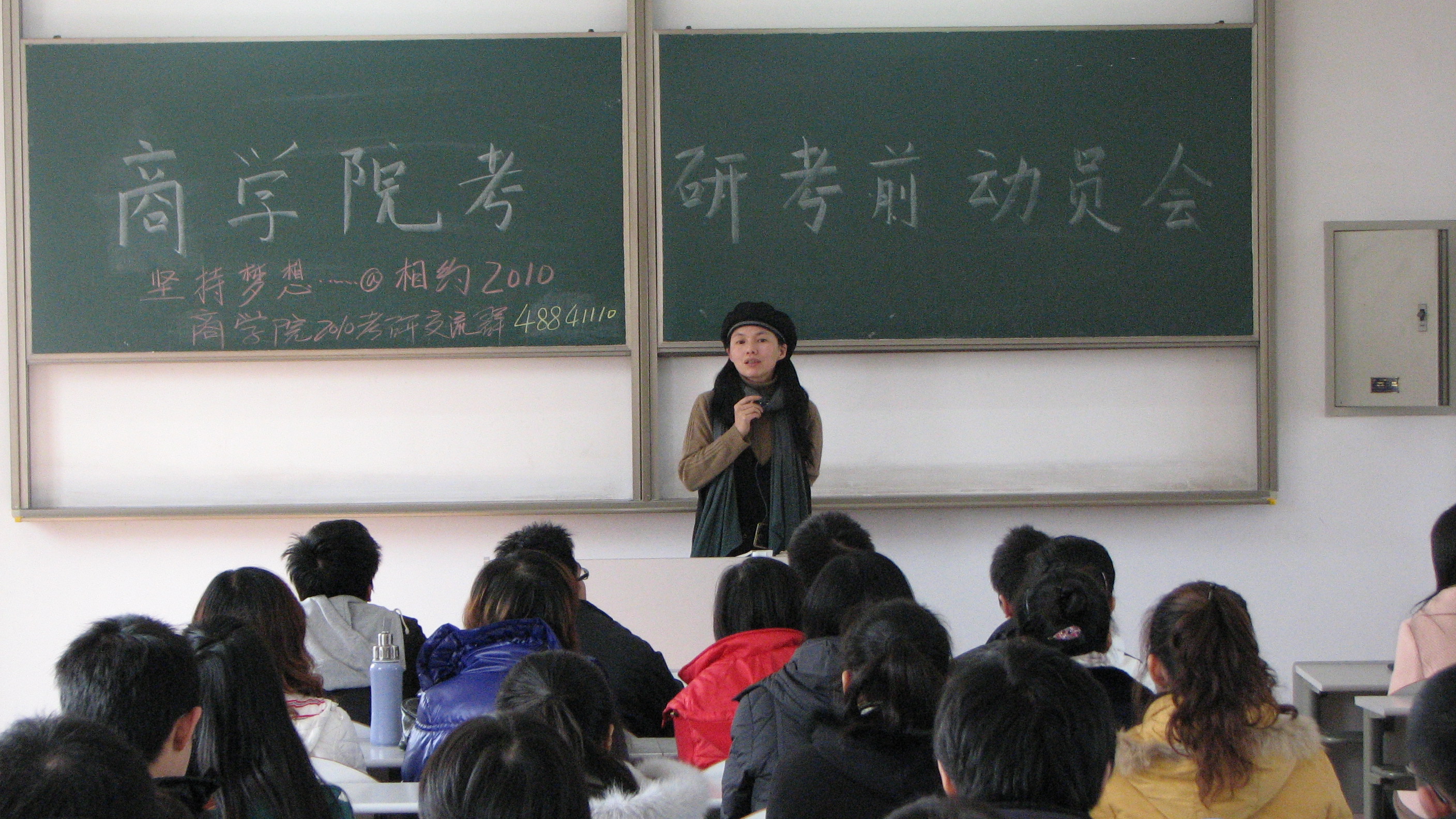 12月7日中午12点半,百家乐赔率 在教一403召开了针对2010届考研学生的考前动员大会。百家乐赔率 党总支副书记郝文静老师主持动员会,鼓励在座的学生把握最后的复习时间,将考研坚持到底。郝老师从百家乐赔率 06年优秀毕业生周国芳考研经历讲到考研的目的和意义,鼓励大家为了提高生活质量,到达更广阔的人生平台,在最后的复习时间刻苦努力,坚持考研。郝老师特别强调了个别考生在考试过程中中途放弃,剩下一门或几门没有考完,结果后悔莫及的情况。