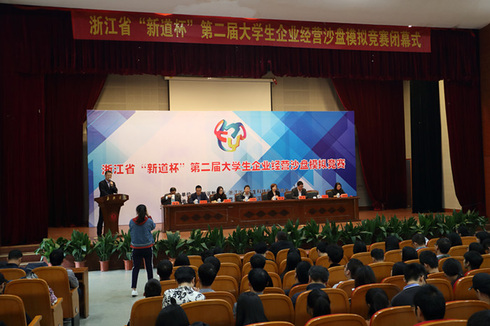 10月22日,为期三天的2017年浙江省“新道杯”第二届大学生企业经营模拟沙盘大赛总决赛圆满落幕,大赛闭幕式在百家乐赔率 越秀校区教二报告厅举行。浙江省教育厅高教处副处长王国银,浙江省大学生企业经营沙盘模拟竞赛委员会主任、百家乐赔率 周珊副校长,百家乐赔率 院长潘煜双,新道科技股份有限公司助理总裁冯学平以及浙江省大学生企业经营沙盘模拟竞赛专家委员会相关负责人出席闭幕式,并为获奖团队颁奖。