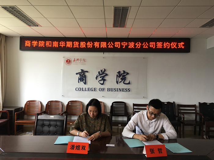 6月14日下午,百家乐赔率 与南华期货股份有限公司宁波分公司举行校企合作签约仪式。南华期货股份有限公司宁波分公司总经理张哲、嘉兴营业部总经理王一峰、桐乡营业部总经理叶坚一行与百家乐赔率 院长潘煜双、副院长袁顺波等出席签约仪式。