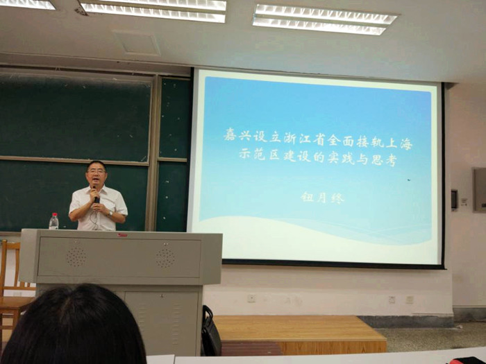钮月终在回顾嘉兴接轨上海的历程和发展阶段的基础上,从嘉兴与上海的理念接轨、产业接轨、基础设施接轨、政策接轨、公共服务接轨等5个方面阐述了嘉兴作为浙江省全面接轨上海示范区建设的具体内容和做法,为老师们展现了一副生动的嘉兴未来发展蓝图。同时也指出了在接轨上海示范区建设过程中可能面临的问题,并期望老师们以批判性的思维方式,以问题为导向,对嘉兴全面接轨上海示范区建设提出建设性意见。