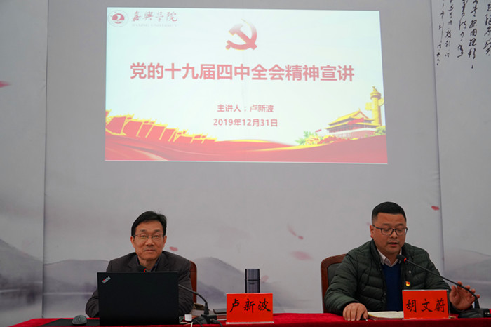 2019年12月31下午,校党委十九届四中全会宣讲团成员、校长卢新波为百家乐赔率 、南湖百家乐赔率 教职工作党的十九届四中全会精神宣讲报告。报告会由南湖百家乐赔率 党委书记胡文蔚主持。百家乐赔率 、南湖百家乐赔率 班子成员及两个百家乐赔率 的教职工到会聆听。