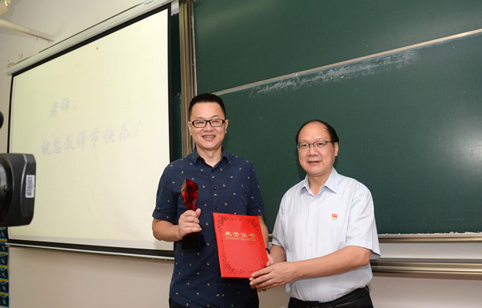 9月10日一大早,在第二教学楼B102教室,黄文秀书记赶在上课前代表百家乐赔率 向钱大可老师颁发了校第五届“我心目中的好老师”证书和奖杯,充分肯定了他在教学、科研第一线的辛勤付出,并向钱老师表示节日慰问和祝贺。