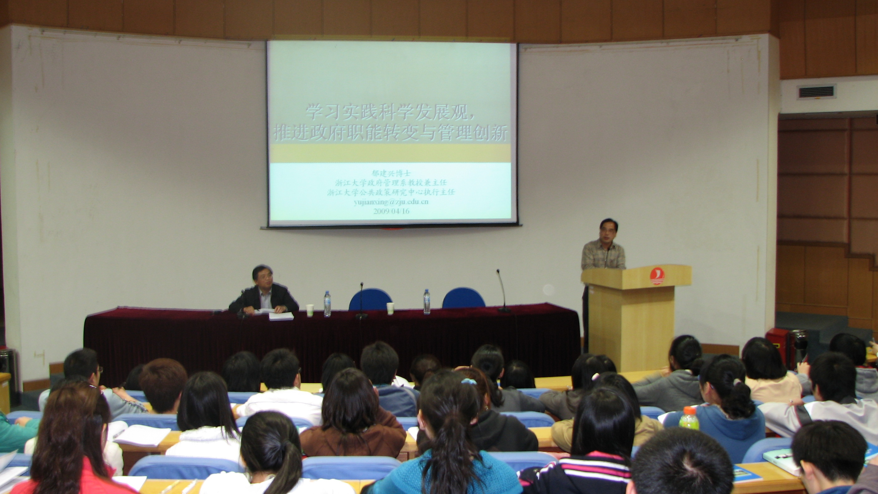 2009年4月16日晚,由百家乐赔率 主办,浙江大学公共管理百家乐赔率 博导、浙江大学公共政策研究中心执行主任、浙江省公共管理学会副会长郁建兴教授主讲的“学习实践科学发展观,推进政府职能转变与管理创新”学术报告在行政楼一楼报告厅举行。