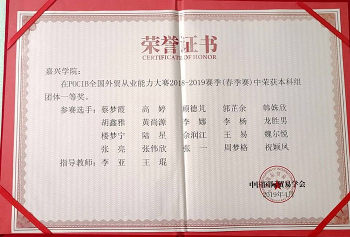 该比赛既是团体赛,也是个人赛,需要团队中20位选手在20天赛程中在线仿真操作完成400笔进出口交易。本届POCIB大赛共有179所院校、237支队伍、共计4740名选手参加。在长达20天马拉松式的赛程中,百家乐赔率 赛队共完成400笔进出口业务,缮制各类业务单据约5000余张,撰写业务函电约4000封。大赛不仅提升了参赛选手的多项外经贸专业综合技能,更是培养了团队合作精神、外经贸职业素养和积极向上、努力奋斗的拼搏精神。同时充分体现了百家乐赔率 《国际贸易实务》示范课程建设的育人成果,和百家乐赔率 国际经济与贸易专业实践教学改革的显著成效。