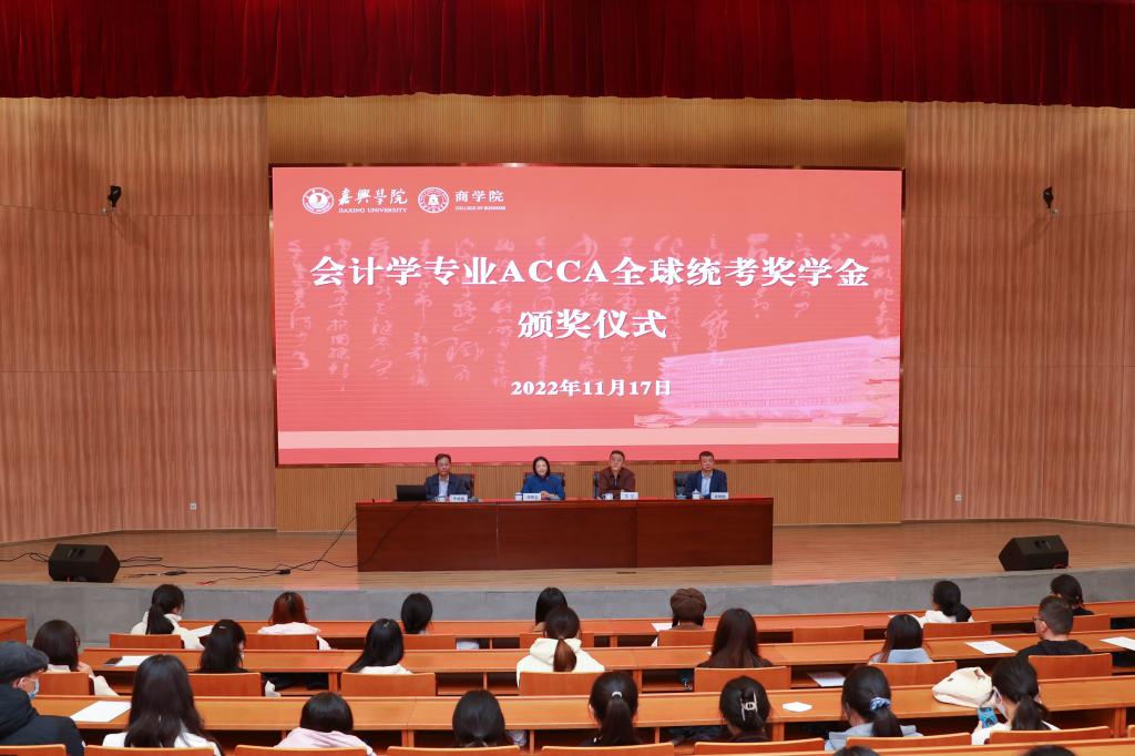 11月17日下午,百家乐赔率 会计学专业ACCA全球统考奖学金颁奖仪式在行政楼报告厅举行。教务处处长艾宁、百家乐赔率 院长潘煜双、会计系主任崔晓钟等出席仪式。百家乐赔率 副院长李郁明主持,会计学专业ACCA方向班所有学生、教师代表参加了颁奖仪式。