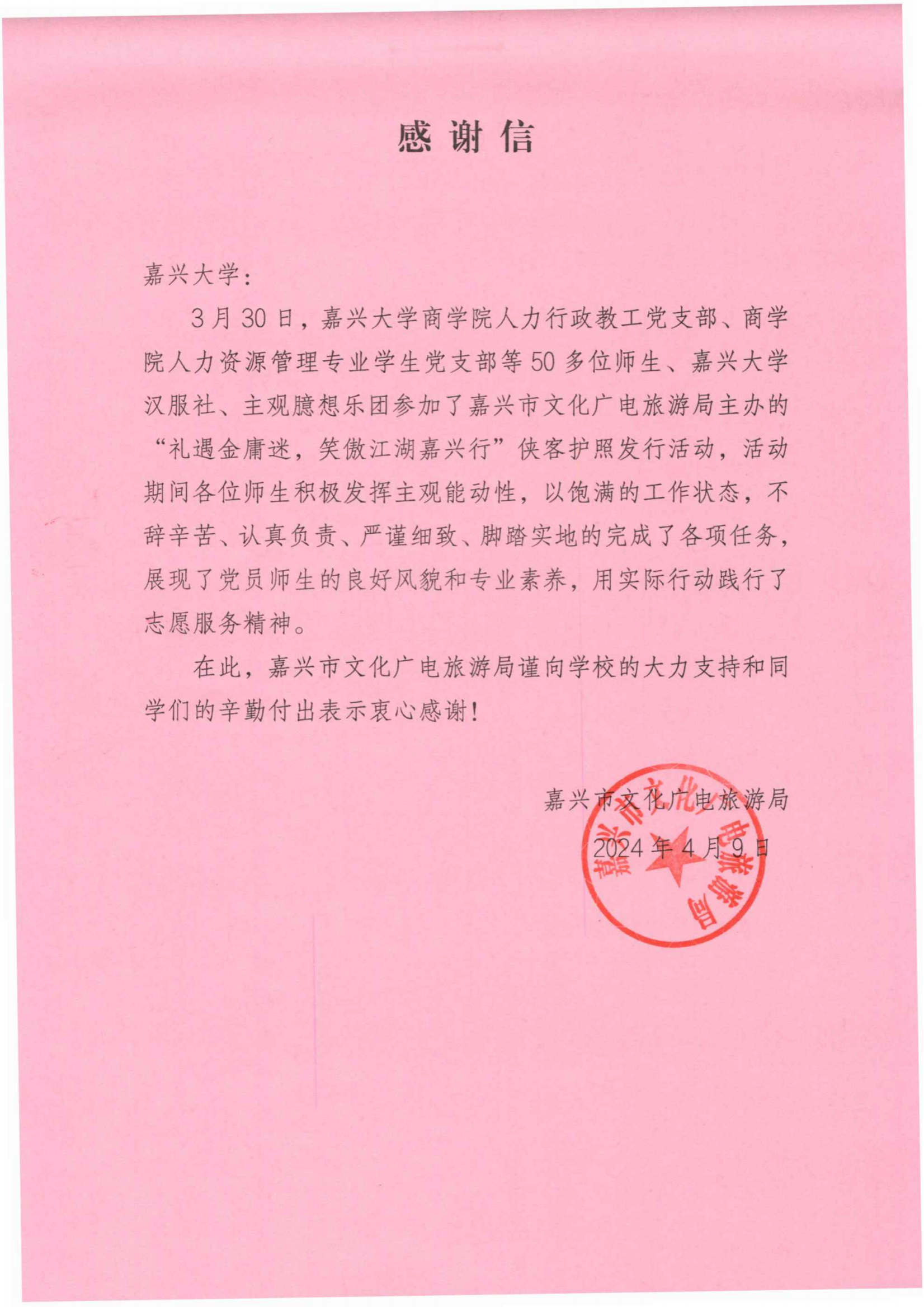 近日,嘉兴市文化广电旅游局给百家乐赔率 发来了一封感谢信。信中,嘉兴市文化广电旅游局对百家乐赔率 人力行政教工党支部、百家乐赔率 人力资源管理专业学生党支部等50多位师生在嘉兴子城举行的金庸先生诞辰100周年文化交流活动之 “礼遇金庸迷,笑傲江湖嘉兴行”侠客护照发行活动中的辛勤付出表示感谢与赞扬,并就百家乐赔率 对学生的悉心培养表示肯定。