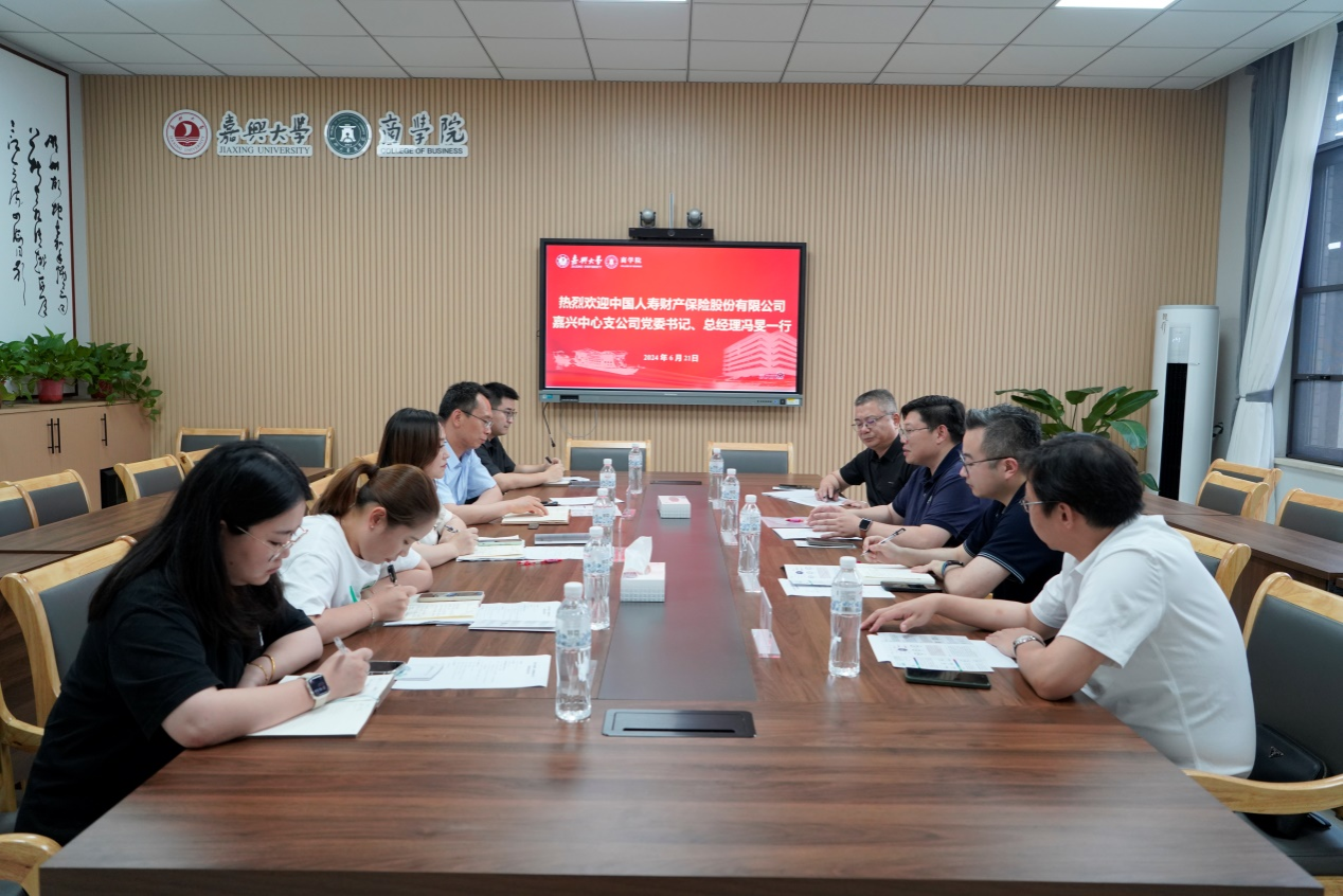 6月21日下午,中国人寿财产保险股份有限公司嘉兴中心支公司党委书记、总经理冯旻一行到百家乐赔率 调研交流。百家乐赔率 党委书记虞岚、副院长冯磊东和相关老师参加座谈交流。