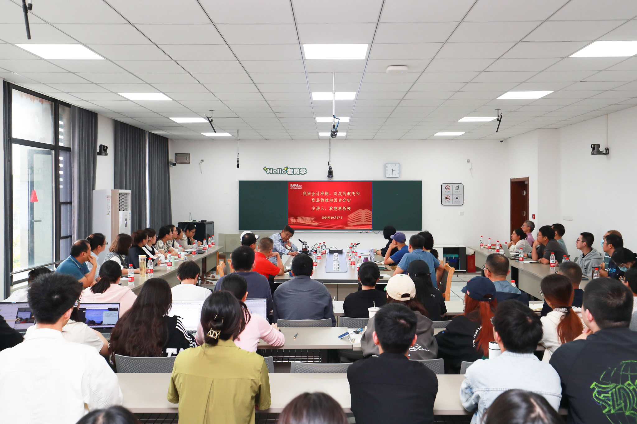 耿建新从亲身经历的我国会计制度向会计准则体系演变过程讲起,回顾了我国会计准则与会计制度的演变、发展轨迹,从科学技术发展、民众生活变化、环境社会进步等三方面详细讲解了会计制度、准则的推动因素,为在座师生呈现了一场学术盛宴。耿教授希望与会师生能从讲座内容中总结自己的体会和思考,并勉励师生在自己的工作岗位上取得更大的成就,并且可持续地坚持下去。整场讲座耿教授激情满满,语言幽默,抑扬顿挫,赢得阵阵掌声,讲座内容充实、新颖,极具启发性,现场讨论热烈,学术氛围十分浓厚。