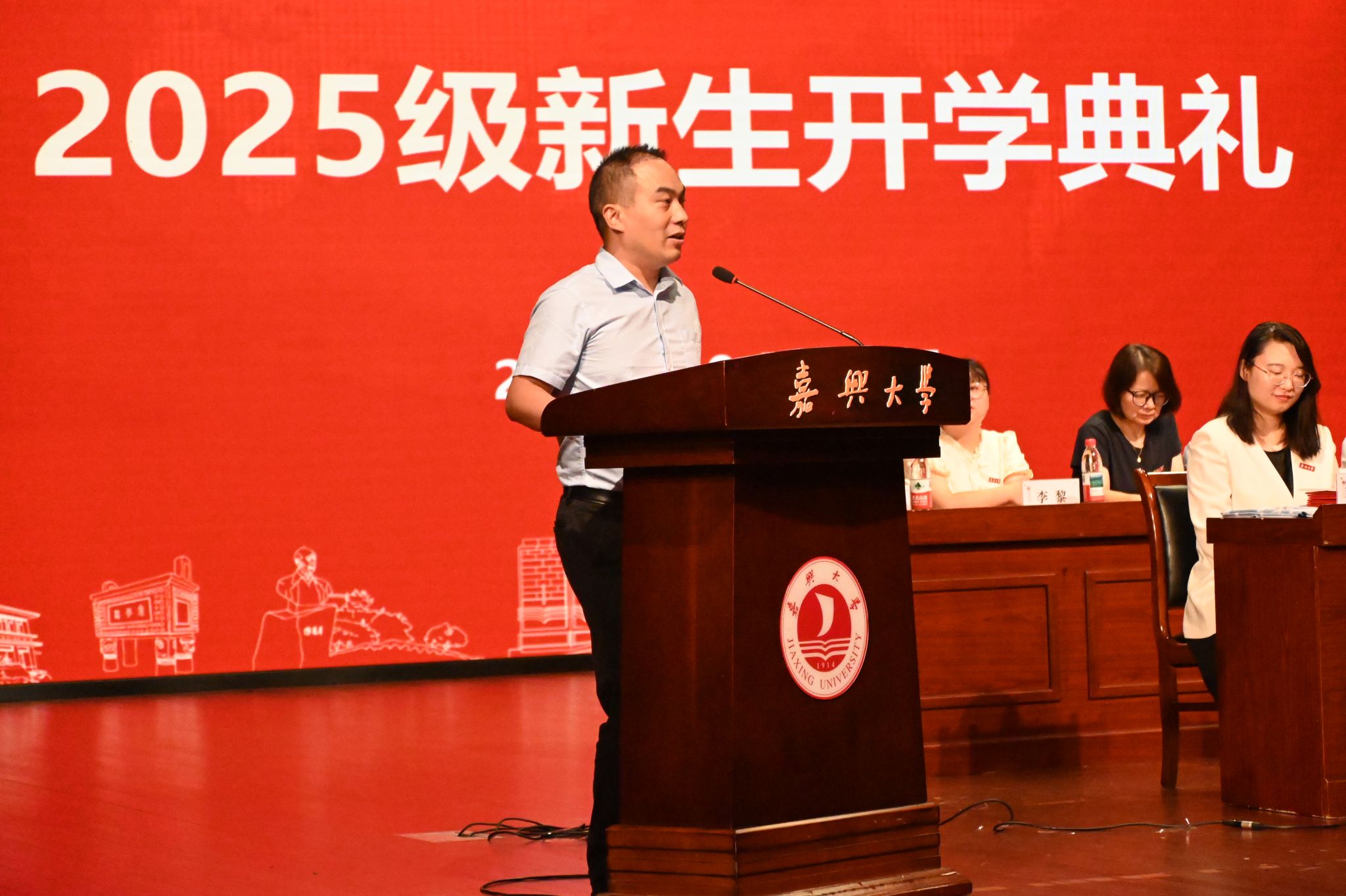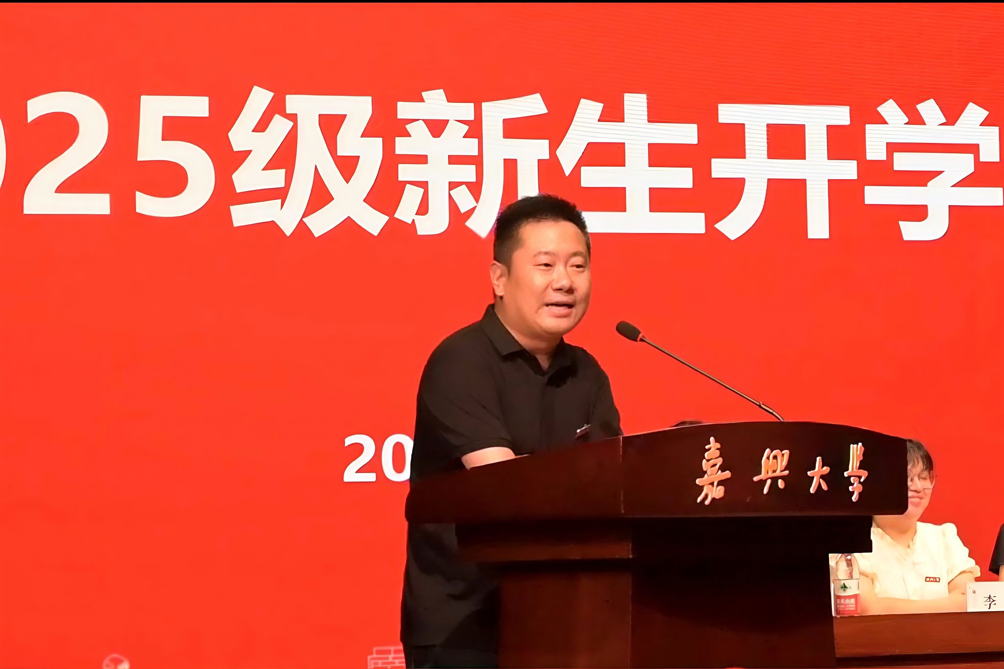 教师代表、南湖优秀青年学者、工商管理系蔡鑫宇以幽默诙谐的语言打破新生对大学 “轻松” 的误解,鼓励同学们培养敢拼、乐观、独立思考三大潜质,以积极心态投身大学自主学习的竞技场。