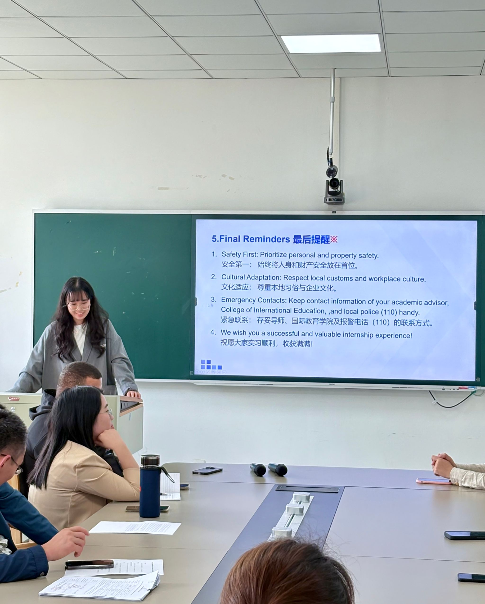 会议伊始,冯磊东代表百家乐赔率 对国际生企业实习与毕业论文工作提出几点要求与希望。他强调国际生在实习过程中要严格遵守中国法律法规,确保合法合规;保持安全意识,防范交通意外、电信诈骗及其他社会风险;毕业论文务必做到学术诚信、按计划有序推进。随后,国际教育百家乐赔率 王雨露老师就国际生企业实习的管理规范、安全须知及实习签注要求等进行了详细说明。她重点提醒学生:实习前必须办理实习签注,未经允许不得随意变更实习单位;实习地点较远需校外住宿,必须提前申请批准;实习期间要签订正式合同,明确工作内容与保险保障,确保合法权益。遵循安全第一、文化适应与紧急联络三项原则,保持好和辅导员与导师的密切联系,遇到突发情况及时求助。