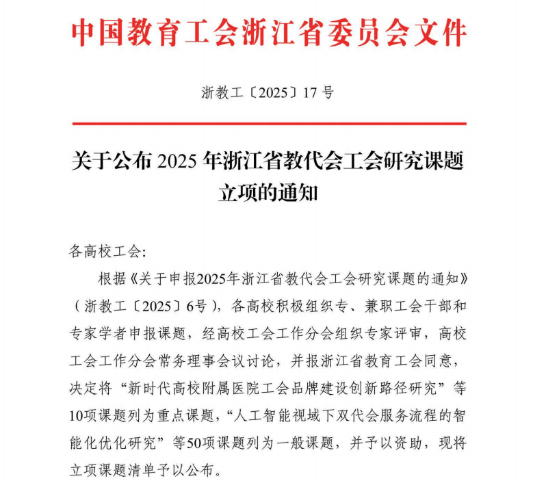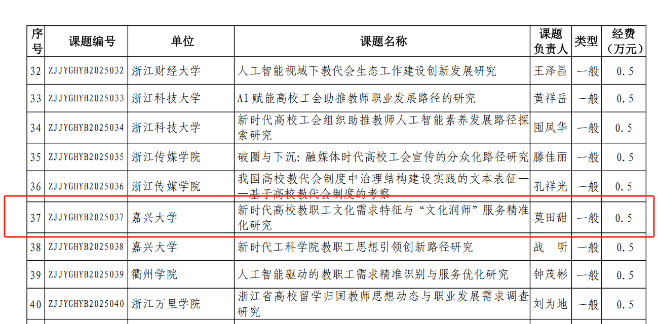 近日,浙江省教育工会公布了2025年浙江省教代会工会研究课题立项名单,百家乐赔率 莫田甜老师申报的课题《新时代高校教职工文化需求特征与“文化润师”服务精准化研究》成功获批为一般课题。