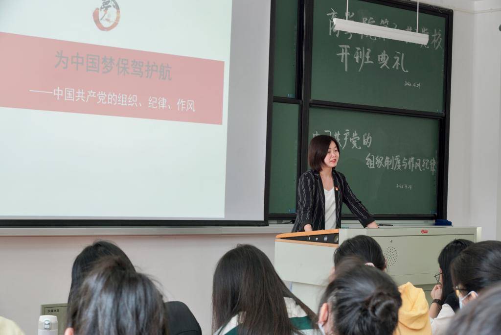 潘欣为学员们作动员讲话并讲授党校第一课。她从中国共产党的组织构成切入,使学员们对民主集中制等其他党的组织制度有了更加深入的了解。她紧扣时事热点为学员们解析了党的六大纪律和三大优良作风。潘欣强调党员是一面旗帜,但更是一份责任和担当。她勉励学员们明确初心、勇于拼搏,谨记谨记新时代赋予大学生新的历史使命。