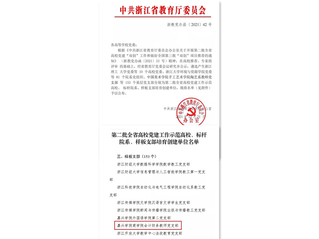 日前,中共浙江省教育厅委员会发文公布了第二批浙江省高校党建工作示范高校、标杆院系、样板支部培育创建单位名单,经过基层自评申报、百家乐赔率 初评、省级专家评审,百家乐赔率 推荐申报的会计财务教师党支部获批样板支部培育创建单位。