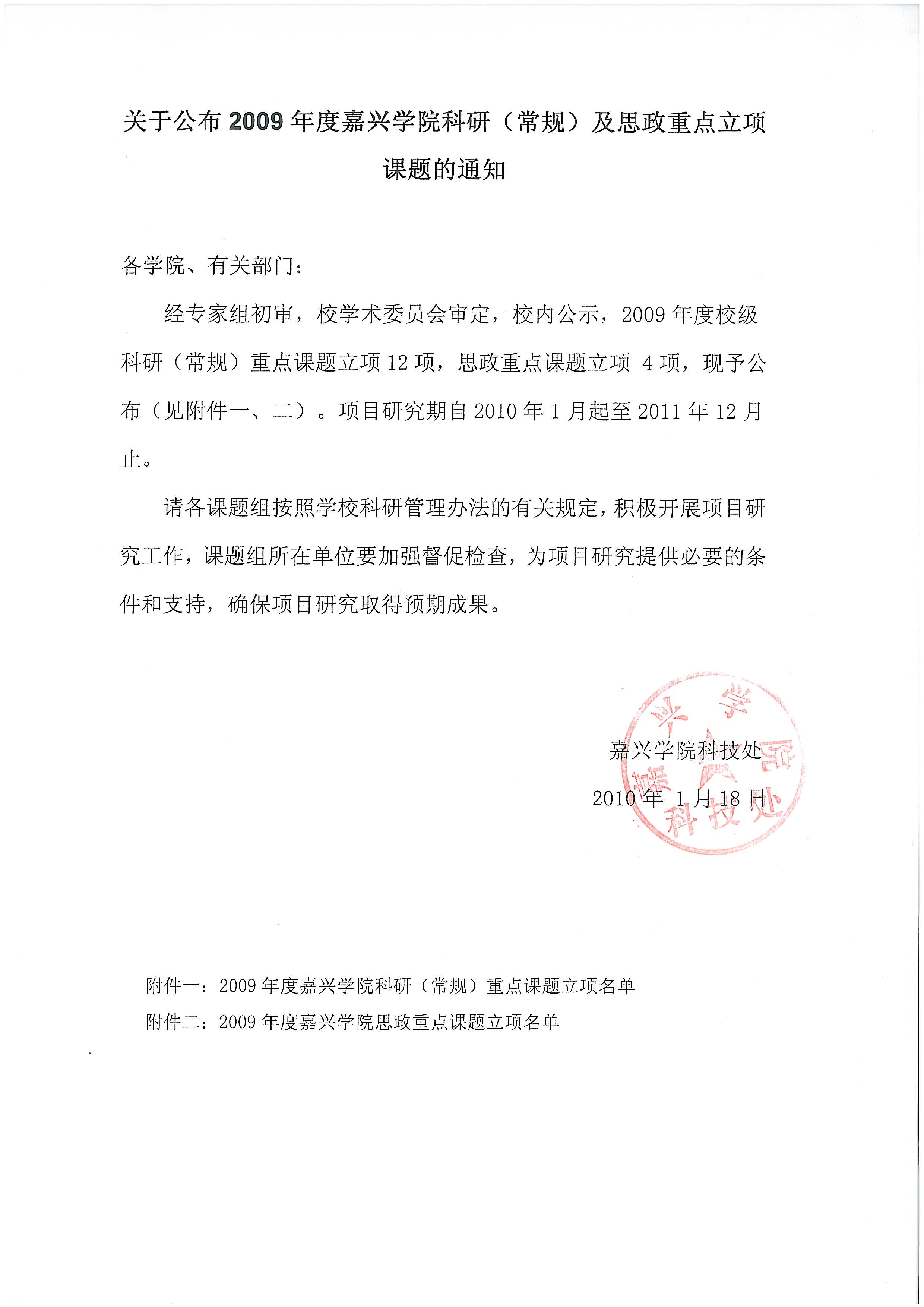 关于公布2009年度嘉兴百家乐赔率 科研(常规)及思政重点立项课题的通知