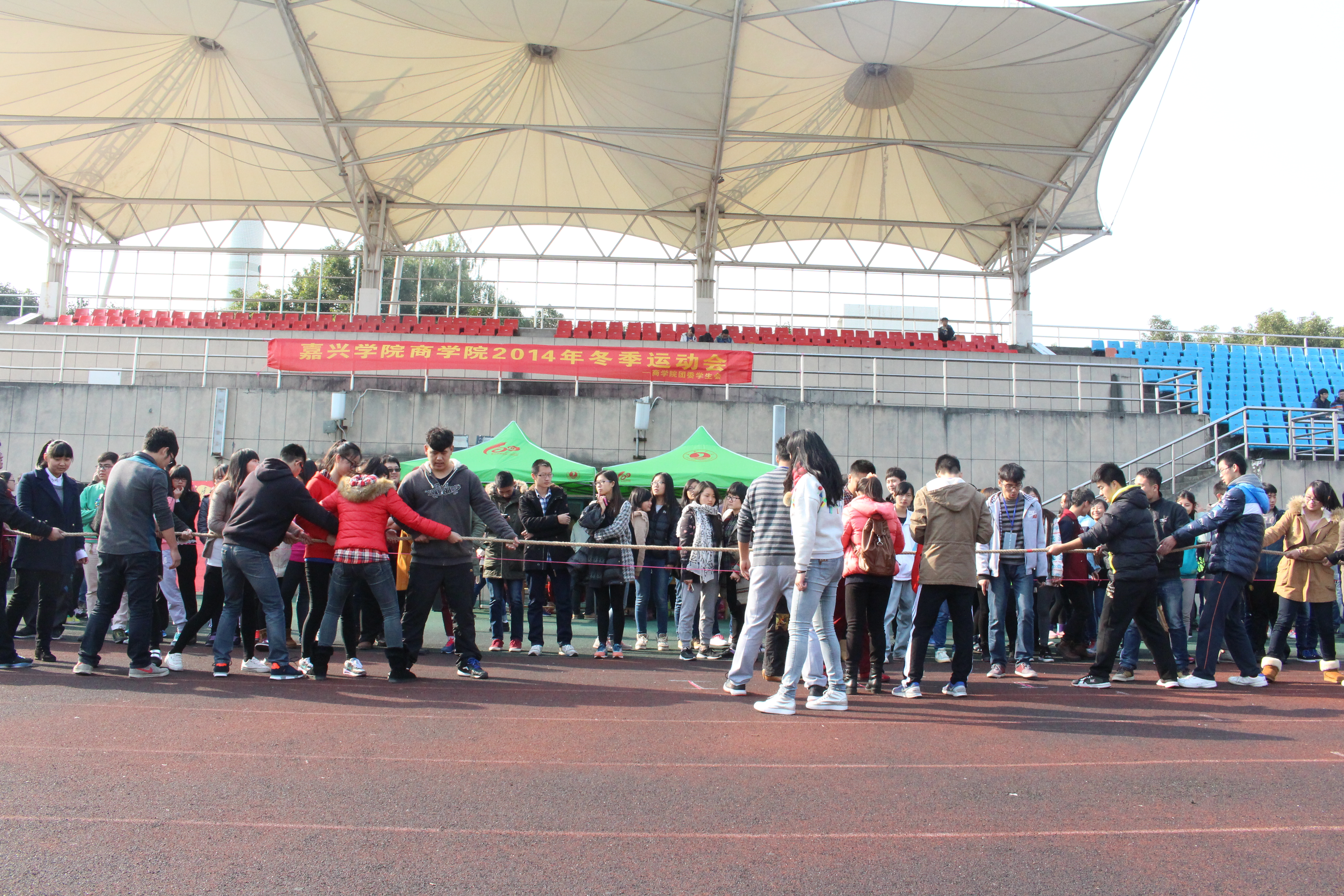 7日是趣味运动项目比赛。虽然天气比较冷,但比赛的热情丝毫没有受到影响。在4*100抱球接力中既气氛紧张又笑点百出,引得加油助威的啦啦队们阵阵笑声。在六个项目比赛中,给人印象最深的是拔河,有的队员在拔河中滑倒了,顾不上疼痛,爬起来继续比赛。12月7日下午运动会圆满结束,为期两天的运动赛,最终总得分为人力代表队排名第一,金融代表队排名第二,国经代表队队排名第三。