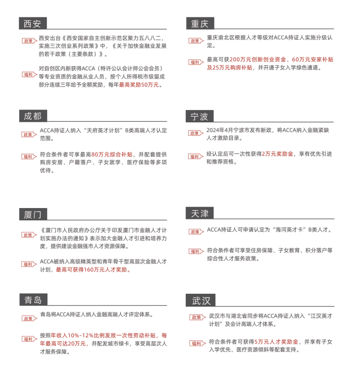 ACCA作为专业的会计师组织,广受政府以及行业协会认可,在政府相关部门、行业协会、企业、 教育伙伴等大力支持下,为中国培养了众多高端财会人才和管理者。目前,包括北上广深的各大 城市已将ACCA人才纳入高端人才发展目录,或作为重点引进培养对象。这是对ACCA会员价值和专业能力的认可,也是对ACCA为推动行业、经济可持续发展所做贡献的认可。 目前为止,ACCA已被列入全国23个省市出台的45项激励政策。