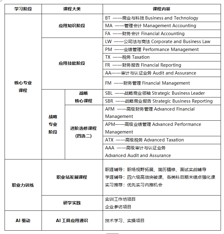 下表为ACCA计划课程与课表,实际授课会视情况有所调整。