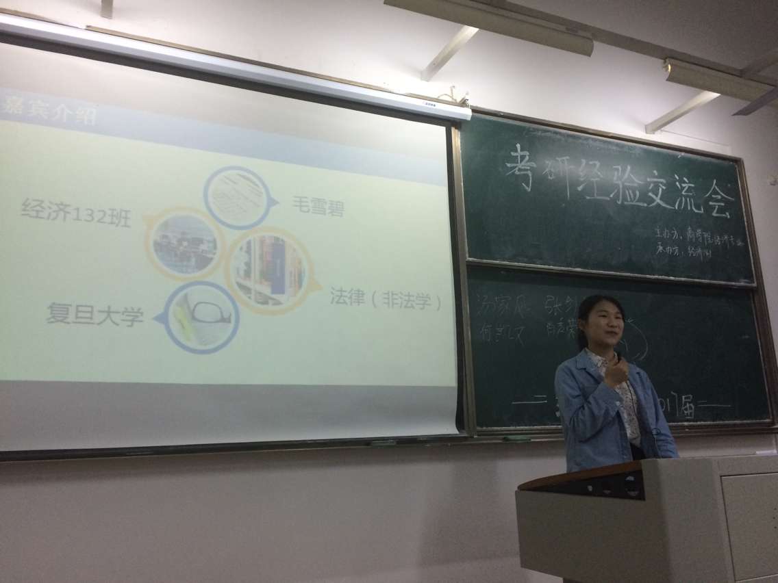 2017年4月20日,由经济141承办的2017届经济专业考研经验交流会在教二B102举行。本次交流会邀请了孟于超(暨南大学)、毛雪碧(复旦大学)、郑梦洁(浙江工商大学)、吴小平(浙江工商大学)和王紫鹦(浙江工商大学)五位经济学专业考上研究生的2017届毕业生。