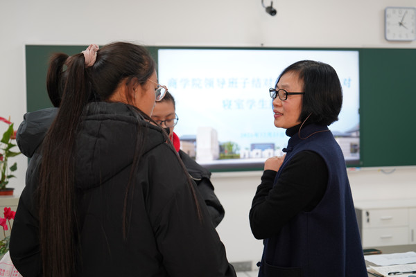 院长潘煜双、党委书记邵燕等与同学们亲切交谈,详细了解同学们进入大学一学期以来的学习生活情况,关切询问了藏族同学和维族同学对当地的气候、环境、饮食以及大学学习等各方面的适应情况,并就同学们遇到的一些问题和困难给予耐心的解答和指导。潘煜双鼓励同学们要树立正确的人生目标和大学四年的学业目标,牢牢把握“学习”核心主题,不断提升自己的综合素质和核心竞争力,以奋发昂扬的精神面貌投入到学习生活中、投入到期末复习考试中。同时也要求同学们以更高的站位,严格遵守校纪校规,严格遵守疫情防控规定,对标标杆寝室,发挥寝室优势,积极创建民族融合、共同进步的特色寝室;对标优秀学长学姐,努力成长为商院学子的优秀代表。
