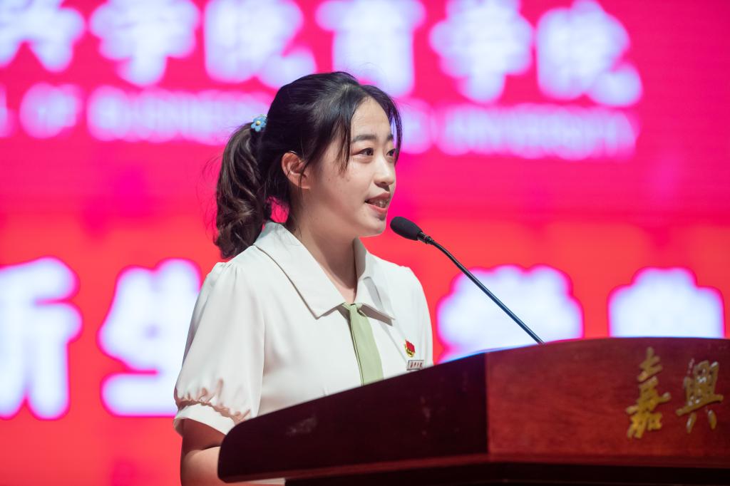财务管理专业2011届校友、中国五矿期货有限公司杭州营业部总经理钱赟作为校友代表发言,她结合自己当年作为新生入校时的感受及学生干部经历,对在座新生提出三点建议,她希望学弟学妹们保持好奇心与批判思维、牢记责任心与创新思维、常怀包容心与开放思维,乘风破浪、奋勇前进,仰望星空赓续初心,脚踏实地坚定匠心,积淀内功丰盈内心,天道酬勤永葆童心。永做前进路上的追梦人!在校生代表、学生会主席会计专业李昕珈,2022级新生代表、工商管理专业钟嘉瑜分别发言。