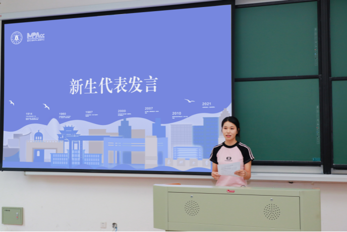 接着,会计硕士242班吴丽群作为新生代表发言,她表示作为研究生在面对未来三年每一次的选择和行动时,都应该不忘初心,保持自我追逐的勇气,在嘉大去成为你想成为的大人。