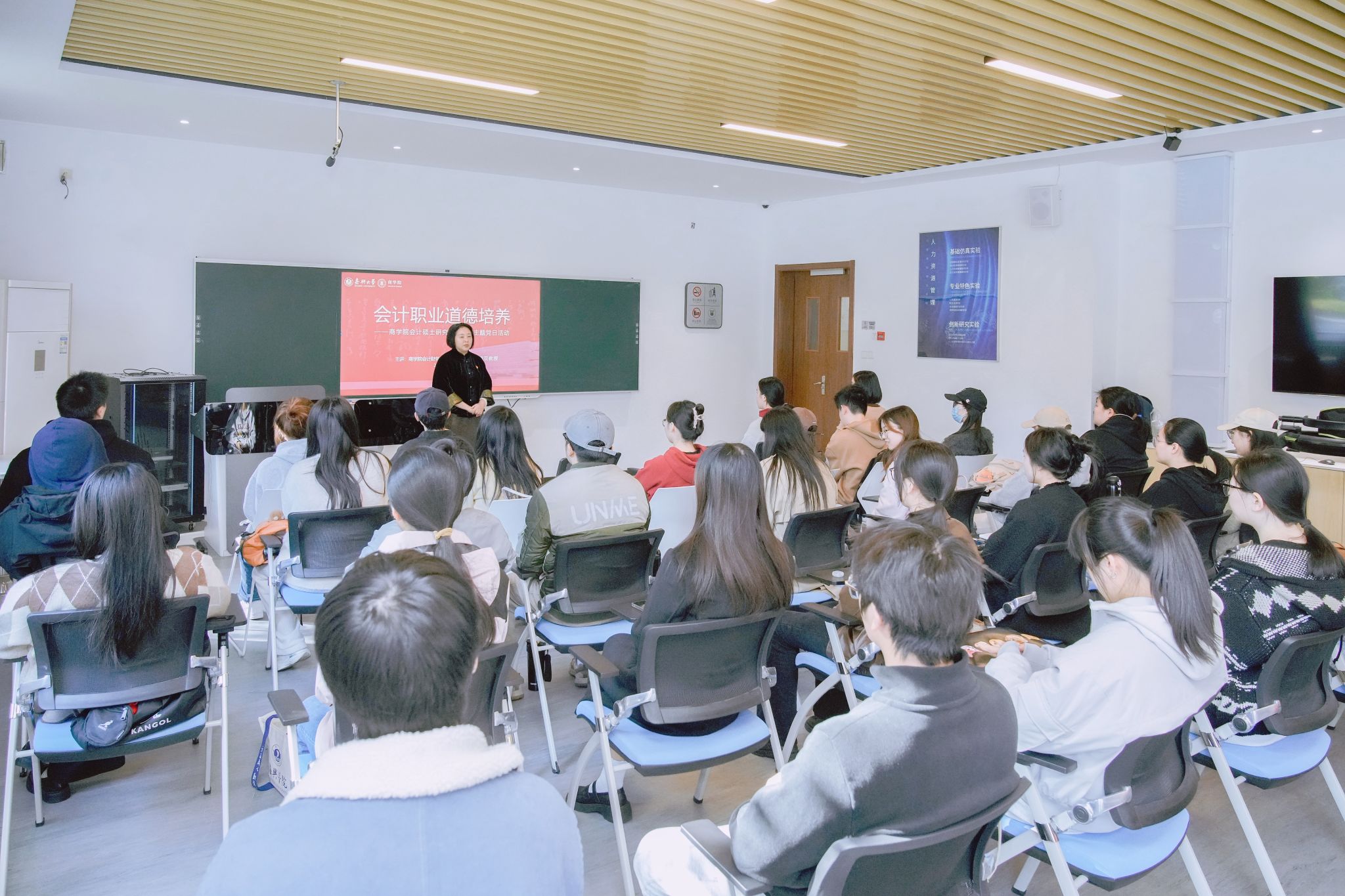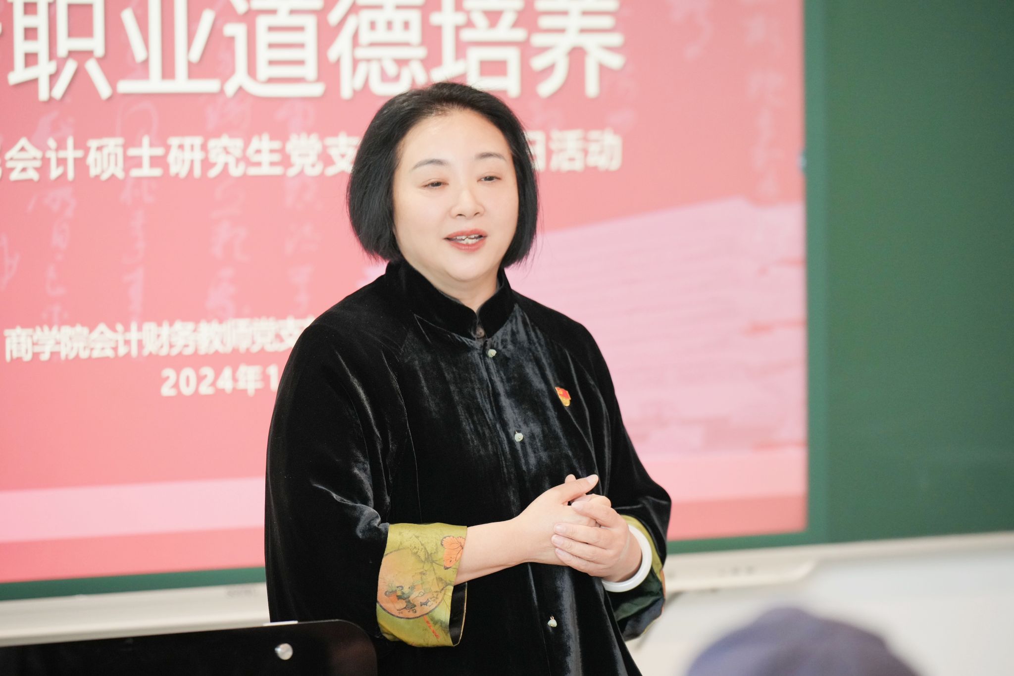 活动邀请到百家乐赔率 MPAcc教育中心主任、百家乐赔率 会计财务教师党支部书记潘煜双教授主讲“会计职业道德培养”党课。潘煜双以会计职业道德的重要性为题,结合当前经济形势和会计行业的发展趋势,分享了会计职业道德教育在课程体系中的新建设,强调了会计职业道德在维护市场经济秩序、保障企业健康发展中的重要作用。潘煜双还指出作为会计专业的学生党员,应当在“做人做事”上起到党员先锋模范作用,一辈子都需修炼职业道德,要敬畏法律,将高标准变成一种习惯,她希望大家能够严于律己,提高觉悟,规避风险。