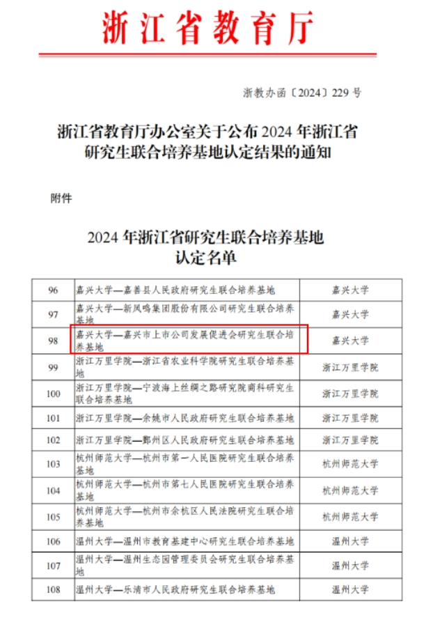 近日,浙江省教育厅办公室发布《关于公布2024年浙江省研究生联合培养基地认定结果的通知》,商学院申报的嘉兴大学嘉兴市上市公司发展促进会会计硕士(MPAcc)研究生联合培养基地”成功获批2024年浙江省研究生联合培养基地。